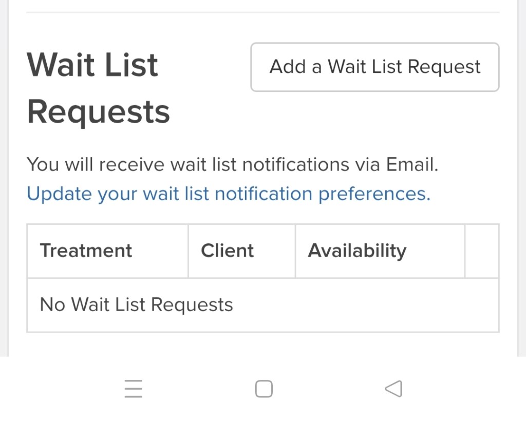 You can put yourself on our waitlist online. Located below your current list of current appointments. You can indicate which days & times you’re available, and how long of a treatment you are requesting. When someone cancels or availability opens up, we have NOW automated the response to email everyone on the list within those parameters immediately. You can then accept or decline at that time.